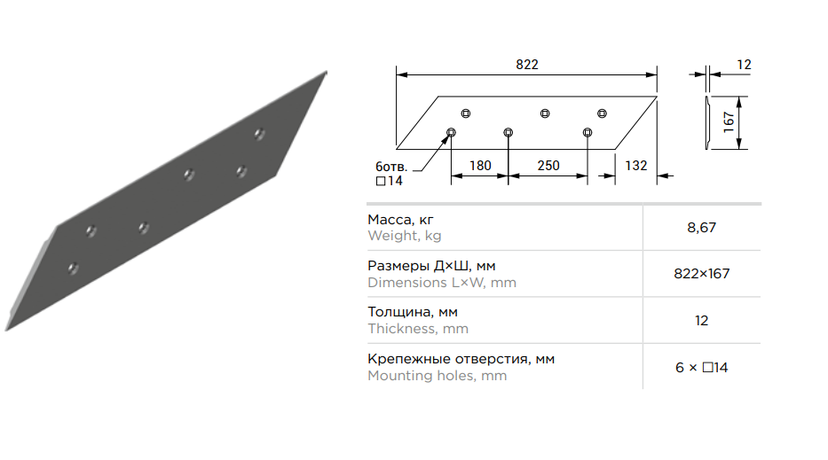 Лемех КГП 01.545В двухсторонний левый 822мм